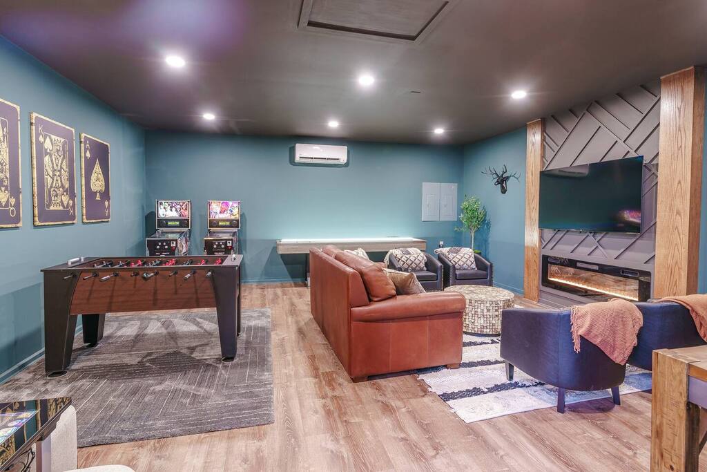 There's a ton to do in the area! Highlands Overlook is about a mile to the slopes and a few minutes’ drive to all the dining and entertainment at Wintergreen. Some of the best hiking trails in the state are off the Blue Ridge Parkway (15 minutes from the home). Also nearby are two sandy-beach-entrance lakes plus a community pool for swimming, and over dozen wineries, breweries, and distilleries- all within a 30 minute drive. The home layout is as follows: Main level: (Note: just 1 small step required to enter main level from flat driveway) - Grand living room with big screen TV - Dining area for 10, plus room for 4 more at the kitchen bar - Fully stocked kitchen with granite counters, stainless appliances, and gas range. Dining nook in kitchen features built-in booth seating. - BR 1: Primary bedroom with king bed. Ensuite bathroom features double vanity and bath/shower combo. - Game room with pullout sofa, oversized TV, electric fireplace, foosball, shuffleboard, 2 pinball machines, infinity board game table, and additional refrigerator - Half bath - Laundry room with full size washer and dryer - Upper deck features dining table for 10, oversized propane grill, pellet smoker, and pizza oven Lower level: - BR 2: King bed with lower deck access - BR 3: King bed with lower deck access - Hall bath with shower/tub combo - Workspace area at end of hallway - Lower deck features hot tub, barrel sauna, seating area with propane firepit, and multiple places to sit and enjoy the view Upper level: - BR 4: King bed with views - BR 5: King bed - BR 6: Bunk room with 2 sets of twin-over-twin beds - Hall bath with shower/tub combo - Loft area with couch, rocking chair, and incredible views