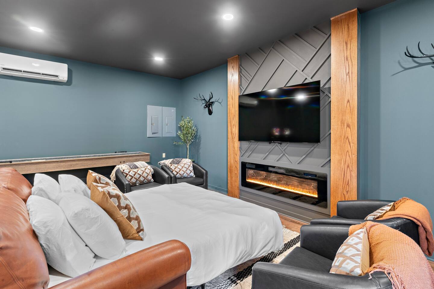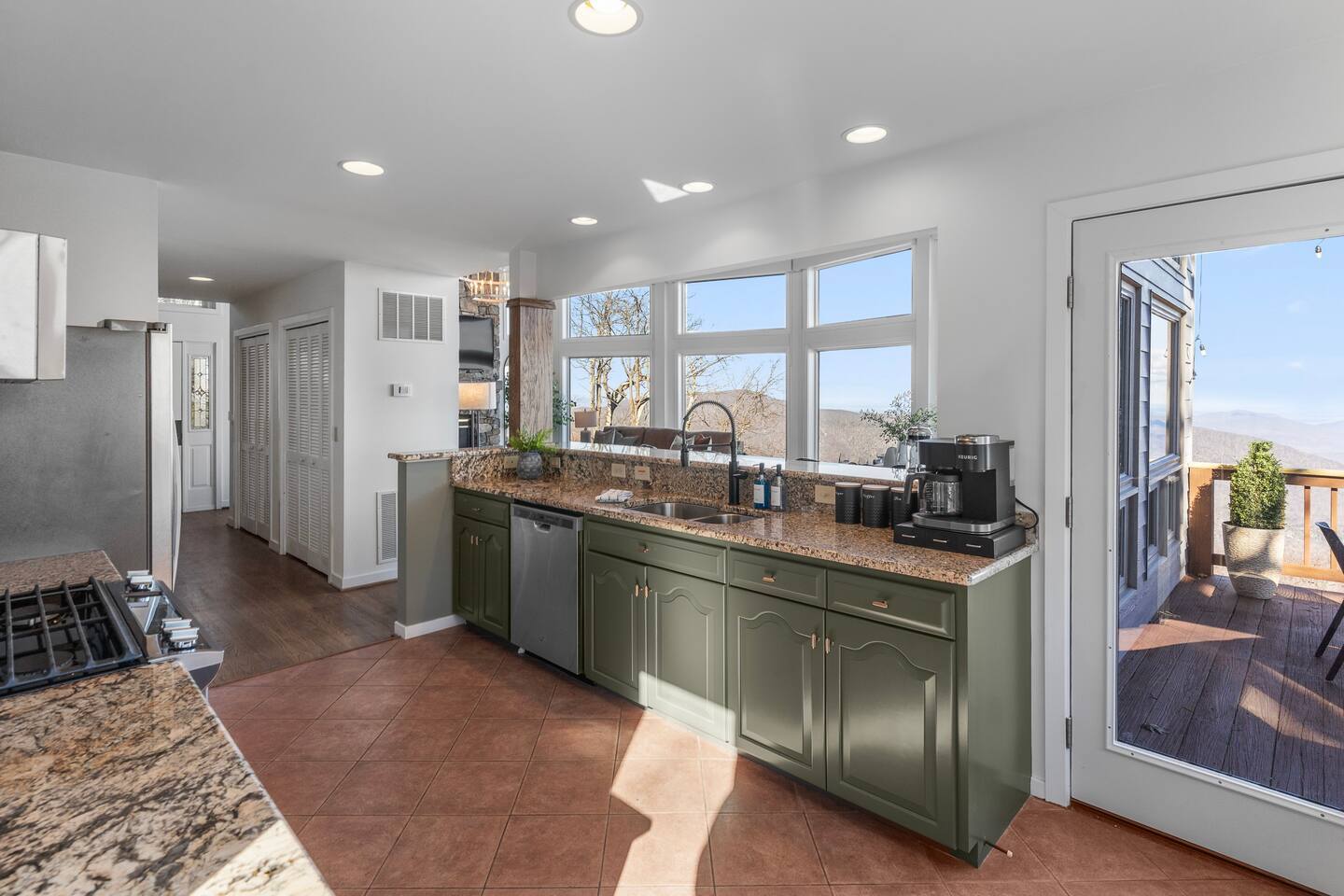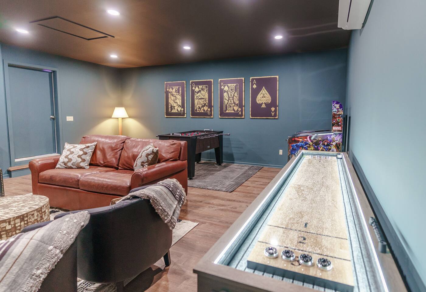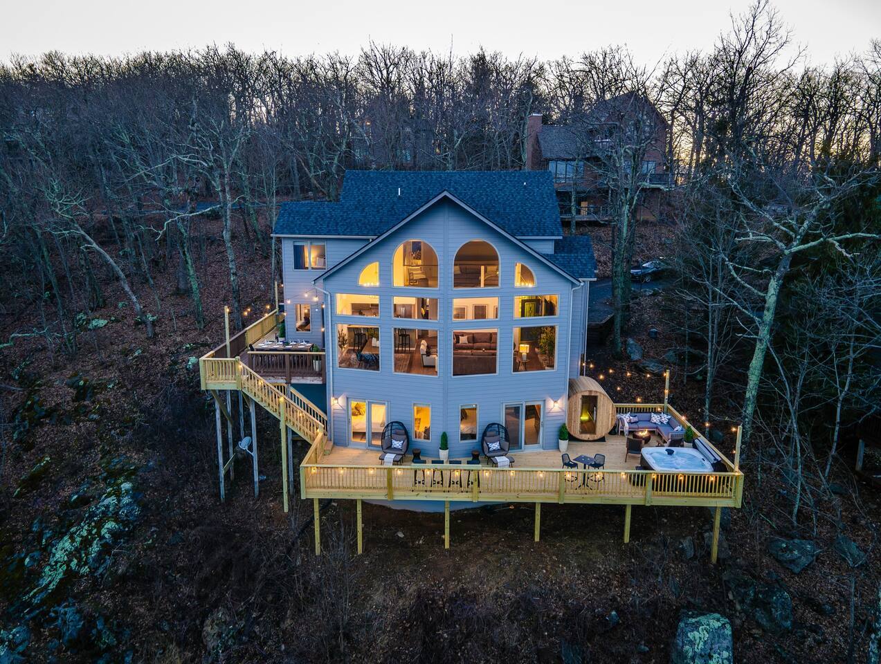 There's a ton to do in the area! Highlands Overlook is about a mile to the slopes and a few minutes’ drive to all the dining and entertainment at Wintergreen. Some of the best hiking trails in the state are off the Blue Ridge Parkway (15 minutes from the home). Also nearby are two sandy-beach-entrance lakes plus a community pool for swimming, and over dozen wineries, breweries, and distilleries- all within a 30 minute drive. The home layout is as follows: Main level: (Note: just 1 small step required to enter main level from flat driveway) - Grand living room with big screen TV - Dining area for 10, plus room for 4 more at the kitchen bar - Fully stocked kitchen with granite counters, stainless appliances, and gas range. Dining nook in kitchen features built-in booth seating. - BR 1: Primary bedroom with king bed. Ensuite bathroom features double vanity and bath/shower combo. - Game room with pullout sofa, oversized TV, electric fireplace, foosball, shuffleboard, 2 pinball machines, infinity board game table, and additional refrigerator - Half bath - Laundry room with full size washer and dryer - Upper deck features dining table for 10, oversized propane grill, pellet smoker, and pizza oven Lower level: - BR 2: King bed with lower deck access - BR 3: King bed with lower deck access - Hall bath with shower/tub combo - Workspace area at end of hallway - Lower deck features hot tub, barrel sauna, seating area with propane firepit, and multiple places to sit and enjoy the view Upper level: - BR 4: King bed with views - BR 5: King bed - BR 6: Bunk room with 2 sets of twin-over-twin beds - Hall bath with shower/tub combo - Loft area with couch, rocking chair, and incredible views